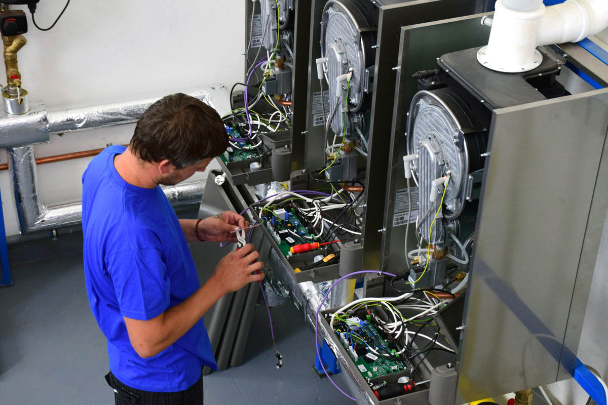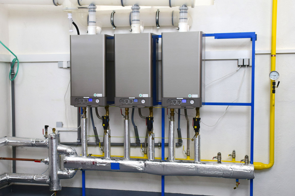 Systém kaskádovej kotolne spočíva v spojení niekoľkých menších závesných kotlov, ktoré spolu, vďaka sofistikovanej regulácii, komunikujú a umožňujú tak bezproblémovú prevádzku. Počas prevádzky sa kotolňa správa ako jeden celok. Výhodou je však široký rozsah modulácie, teda schopnosť pracovať od minimálneho výkonu jedného kotla až po celkový výkon všetkých kotlov v kaskáde. A práve v tejto schopnosti spočíva hospodárnosť kaskádovej kotolne. Vždy dokáže prispôsobiť výkon aktuálnemu stavu tepelných strát v závislosti od vonkajšej teploty.